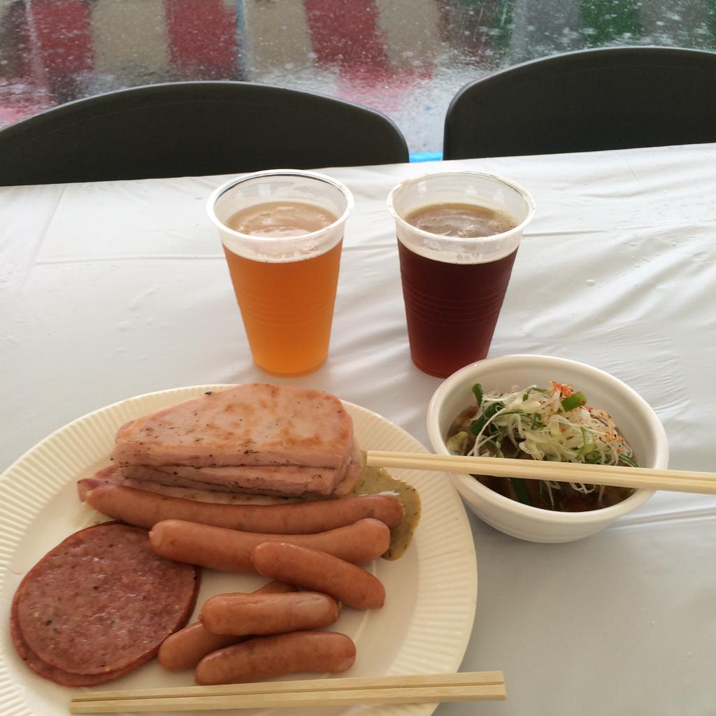 テントがたくさん出てるから普通に飲む分には平気なんだけど、いかんせん寒い&買い物行くのに傘ささなきゃならないのが鬱陶しい。結局ビールを一杯ずつと、牛すじ煮込みと富岡商会のハムソーセージ盛り合わせ(一皿500円でどうかしてる量が来る。写真)、締めに沖縄そば食べて退散しました。「せっかくお金たんまり下ろしてきたのになぁ」と言ったらメガネ氏、「わたしなんか千円札で一万円分持ってきましたよ」だって。やる気満々や! あと、こんな天気にもかかわらず来た人って、真のビール好きと言えるんじゃないか、と思いました。自分含めて。